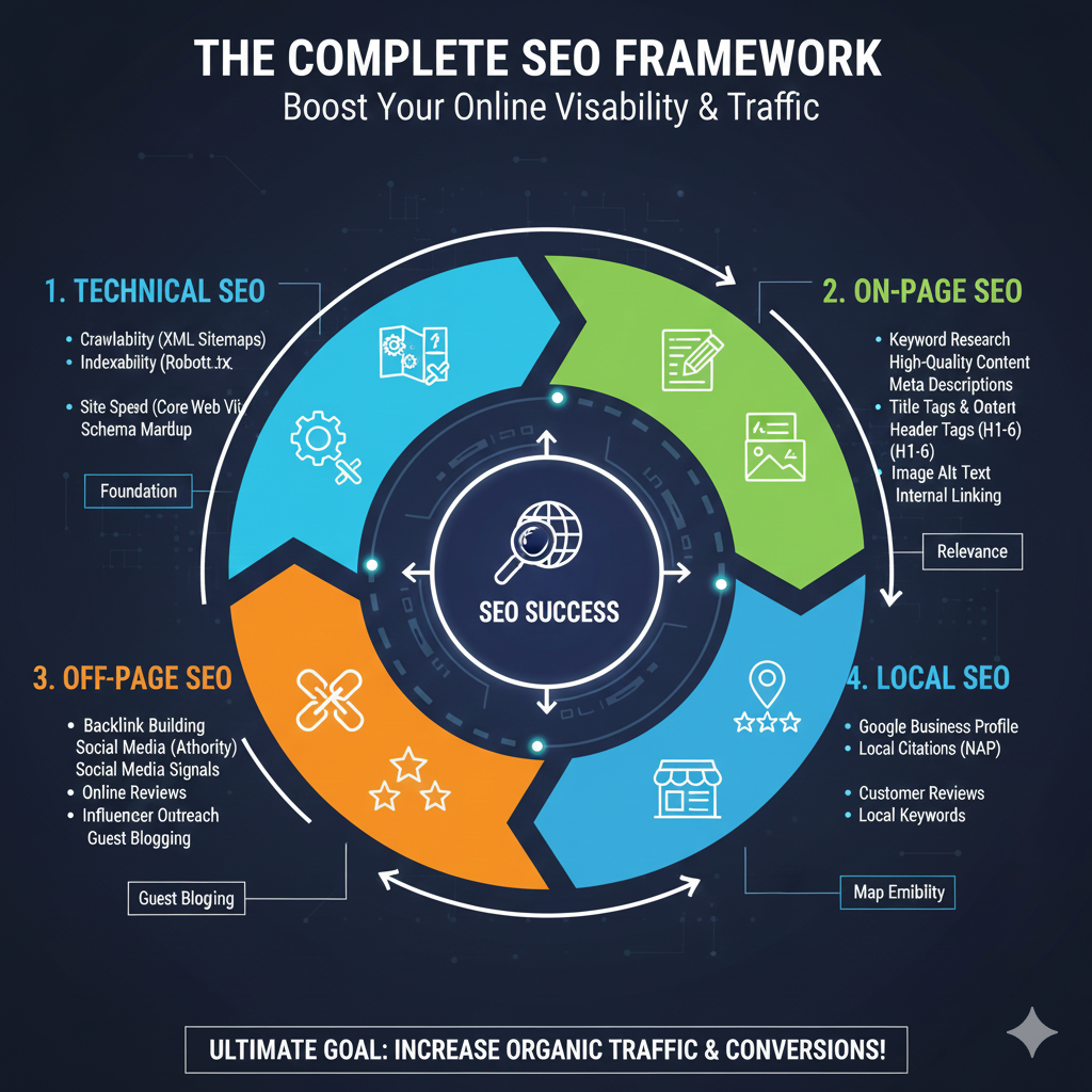 The image is an infographic titled “THE COMPLETE SEO FRAMEWORK: Boost Your Online Visibility & Traffic”. It outlines a cyclical framework for achieving SEO Success by breaking the strategy down into four major components: Technical SEO, On-Page SEO, Off-Page SEO, and Local SEO.